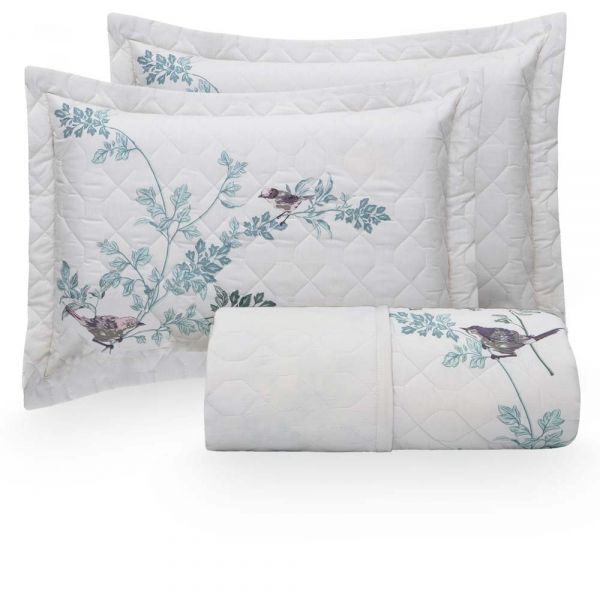 As colchas da linha Vida Bela da Kacyumara são produzidas em 100% algodão, 200 fios e enchimento 100% poliéster com gramatura de 80g/m². Possui toque macio e aconchegante, é antipilling, que evita que o tecido forme bolinhas. O modelo entrega estampa de Pássaros em composição com folhagens que fluem vida e elegância. Perfeito para compor a decoração, além de estar em forte tendência da estação. Colcha dupla face matelada com acabamento em viés por toda a borda; Porta-travesseiros matelados com estampa exclusiva dimensionada e 4 abas. Perfeita para deixar a cama muito mais bonita e arrumada!