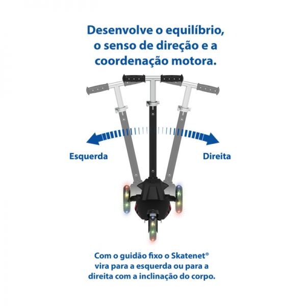 Muitas crianças e adultos adoram andar de patinete, e isso é ótimo, porque é uma opção divertida e que ajuda todo mundo a fazer exercícios. Agora, para aproveitar o melhor que essa brincadeira pode trazer é importante escolher um patinete seguro e prático. O Patinete Skatenet Max da Bandeirante é perfeito para as manobras mais radicais! Ajuda no desenvolvimento do equilíbrio, no senso de direção e na coordenação motora. Com o guidão fixo o Skatenet vira para a esquerda ou para a direita com a inclinação do corpo, conta com 3 rodas com luzes de LED, que acendem com o movimento (Não necessita bateria), uma base com textura para maior aderência e segurança, suspensão dianteira, guidão com regulagem de altura e freio traseiro para garantir a segurança. Certificado pelo INMETRO, trata-se de um brinquedo seguro e ótimo para presentear.